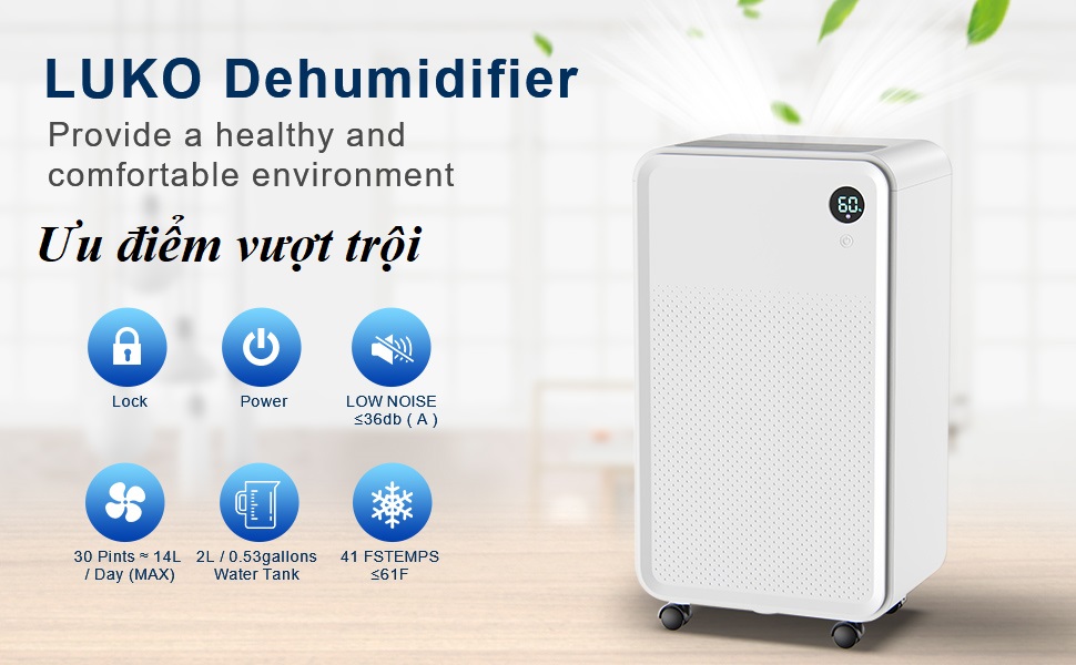 Máy hút ẩm Luko có khả năng hút ẩm vượt trội nhờ hệ máy nén cao cấp mạnh mẽ bền bỉ. Máy có thể hút tới 12L nước 1 ngày và thích hợp cho phòng từ 30 đến 80 m2. Ngoài chức năng hút ẩm, máy hút ẩm Luko còn có chức năng lọc không khí, lọc không khí bằng công nghệ ion hiện đại sẽ tạo ra không gian phòng luôn khô thoáng, sạch sẽ, khô ráo, không còn bụi bẩn và ngăn chặn các vi khuẩn nấm mốc.