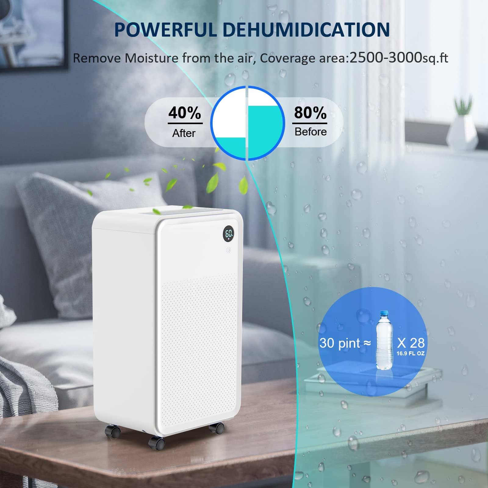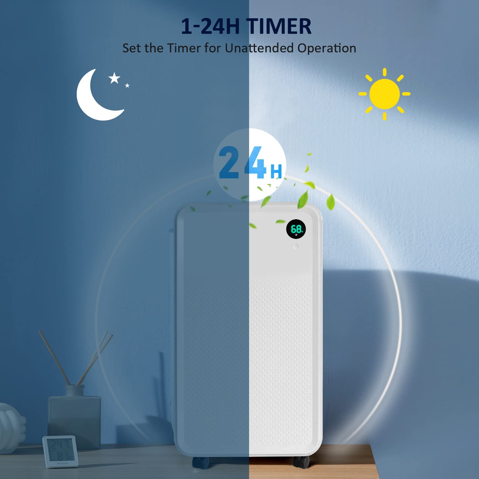 Máy có thể hẹn giờ lên tới 24 giờ, cài đặt độ ẩm như mong muốn, có 4 chế độ hoạt động, 3 màu chỉ thị, 2 tốc độ quạt : Chế độ hoạt động có thể chuyển đổi tự do giữa ngày nắng (60% RH), ngày mưa (40% RH), liên tục / khô (20% RH) và chế độ ngủ.