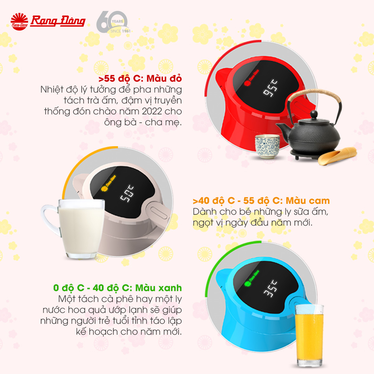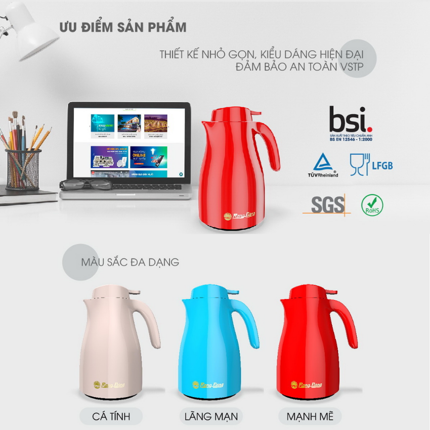 - Nắp có hiển thị nhiệt độ & cảnh báo độ nóng của nước thông qua thay đổi 3 màu xanh, vàng, đỏ của logo, giúp người dùng dễ dàng kiểm soát nhiệt độ nước nóng, thuận tiện khi sử dụng.