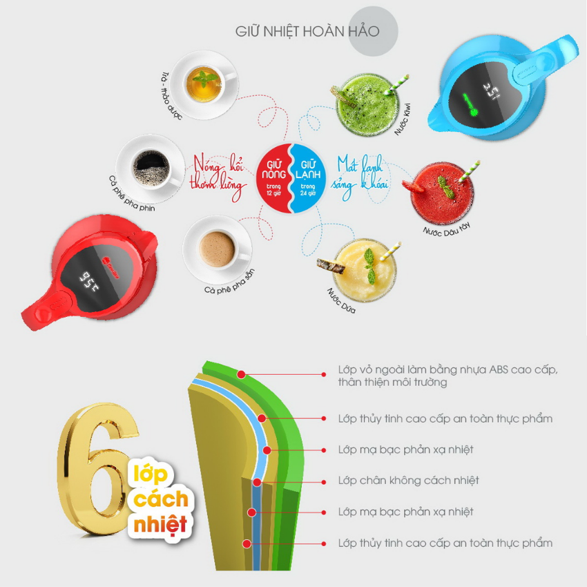 - Thân làm bằng nhựa ABS cao cấp. Gioăng silicone, ruột thủy tinh chất lượng cao, không có yếu tố độc hại, lưu giữ trọn vẹn hương vị đồ uống và an toàn cho sức khỏe. Có lớp chân không cách nhiệt không nóng bên ngoài, tăng độ giữ nhiệt.